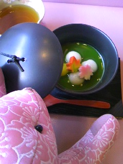 今日のおやつ桜ともみじの生麩入り抹茶ぜんざい